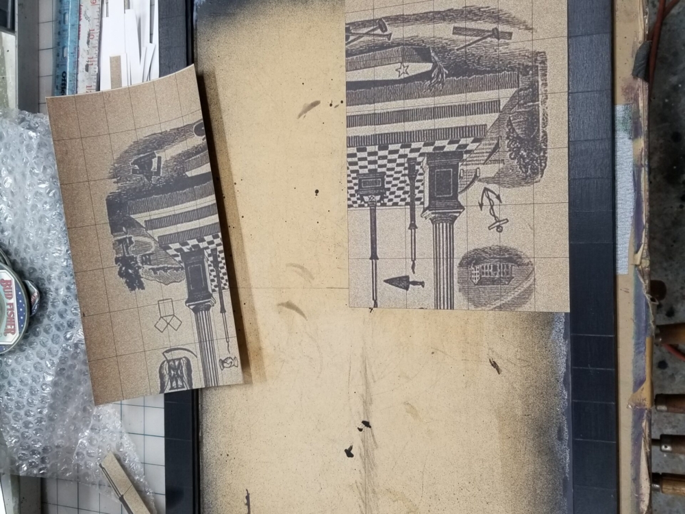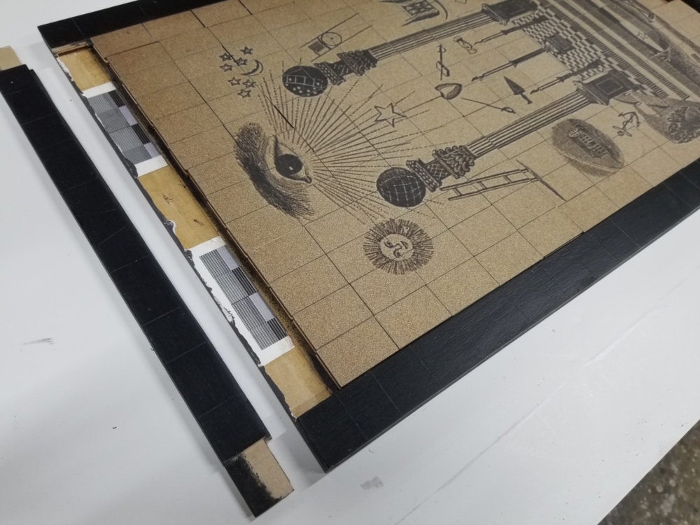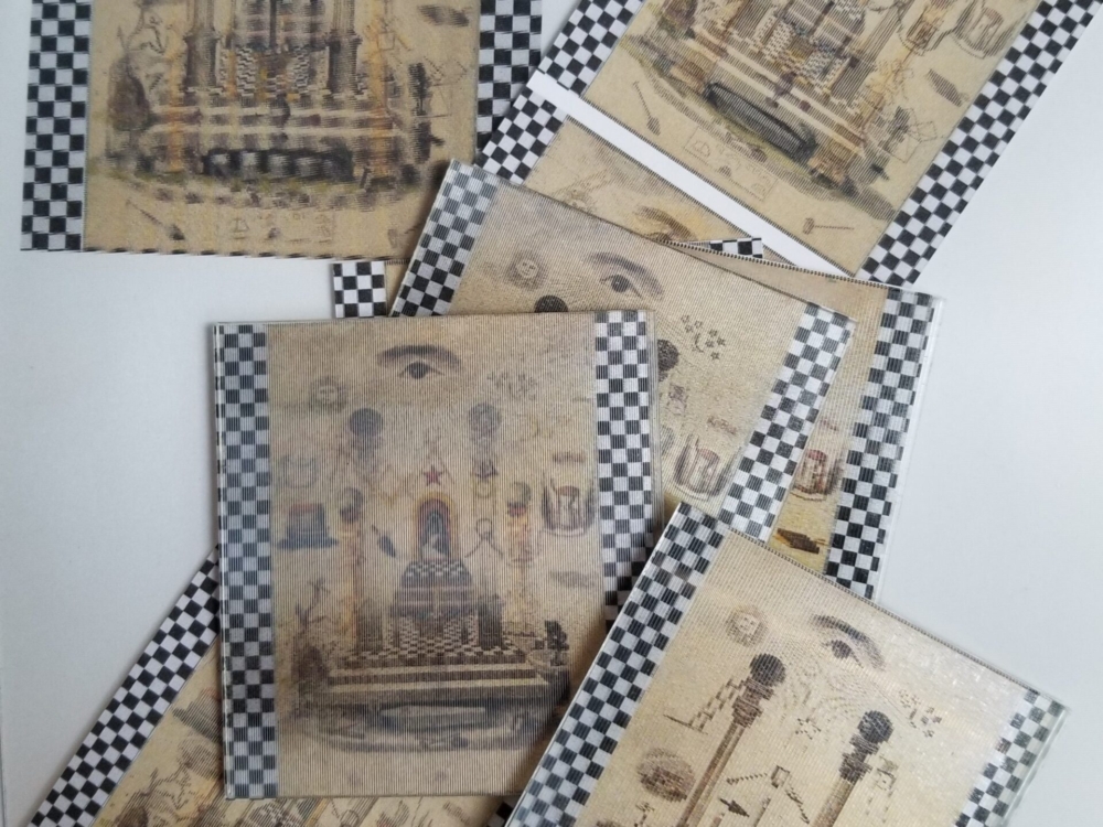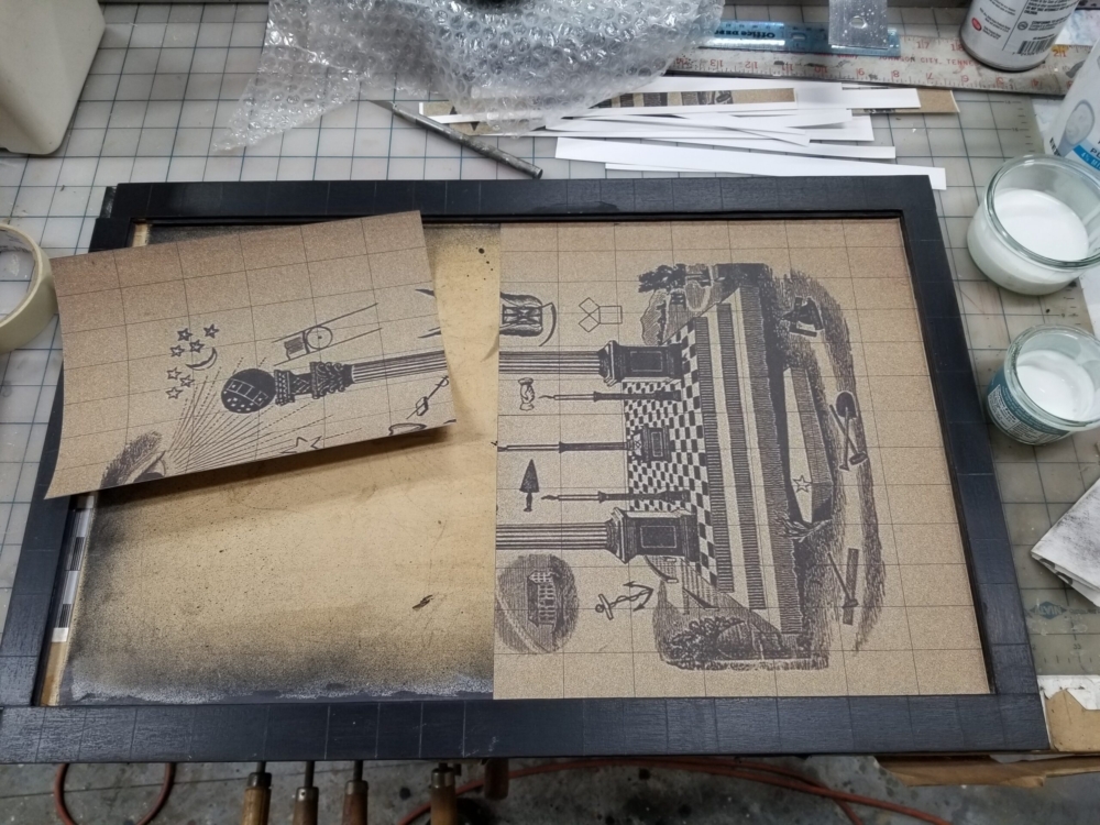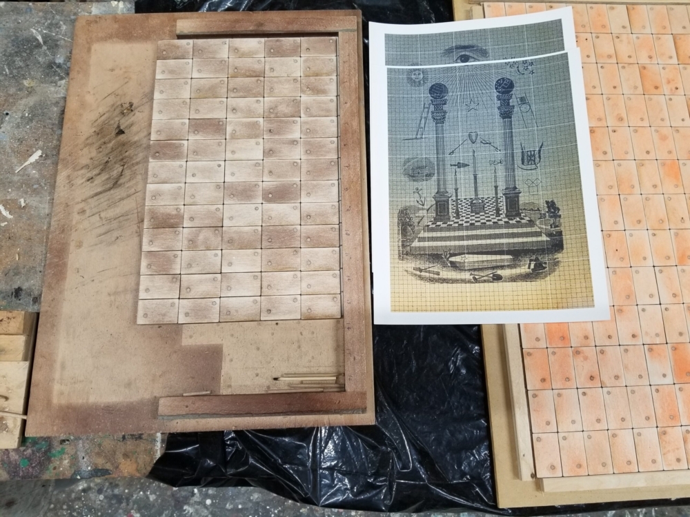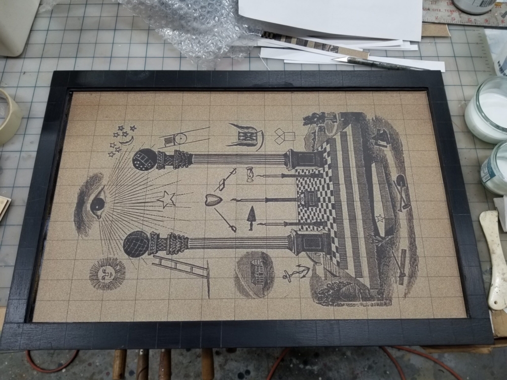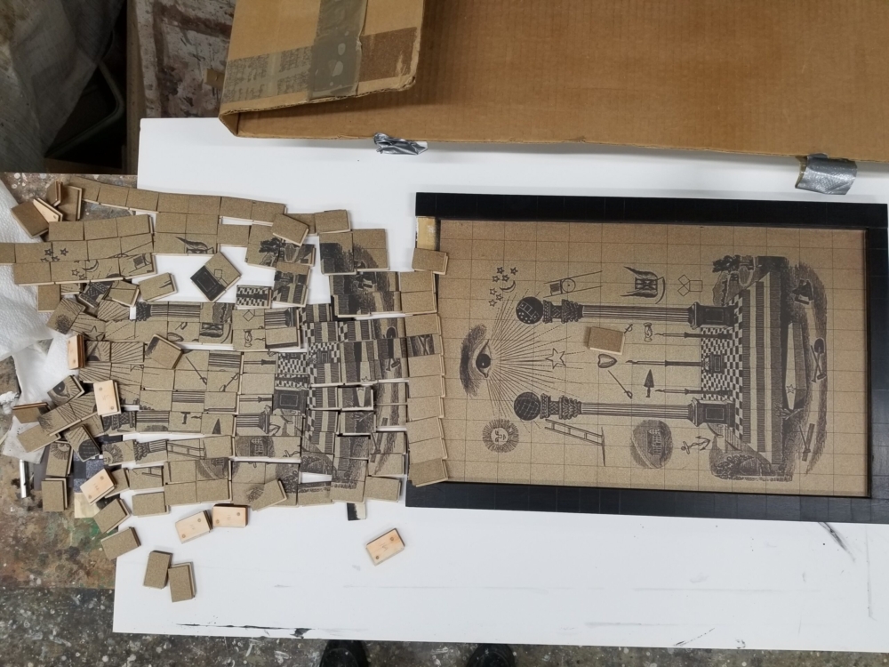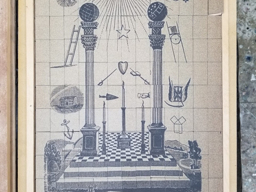 With this particular artwork, I hope the viewer is drawn toward (visually/mentally) rearranging the “15-puzzle” pieces back into classical tracing board coherency, while also considering notions of freemasonic secrecy, aphorisms, and elevatory knowledge.