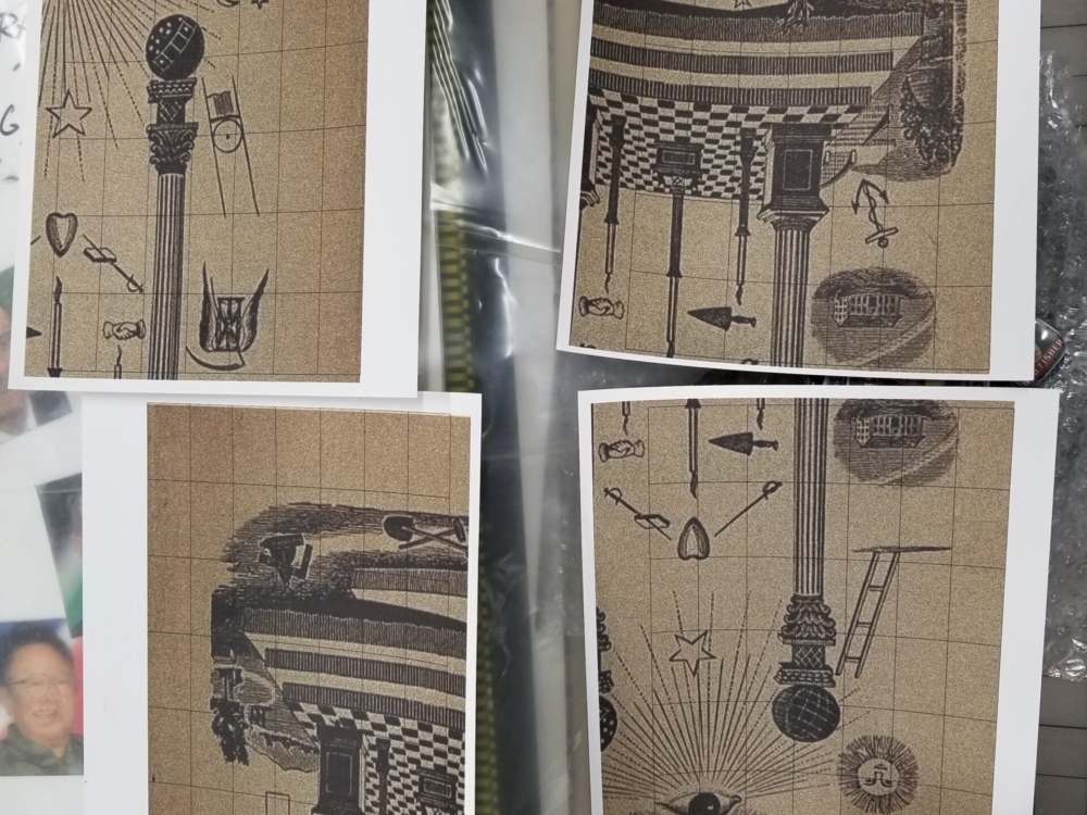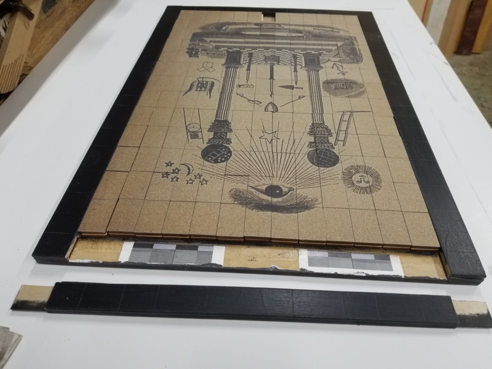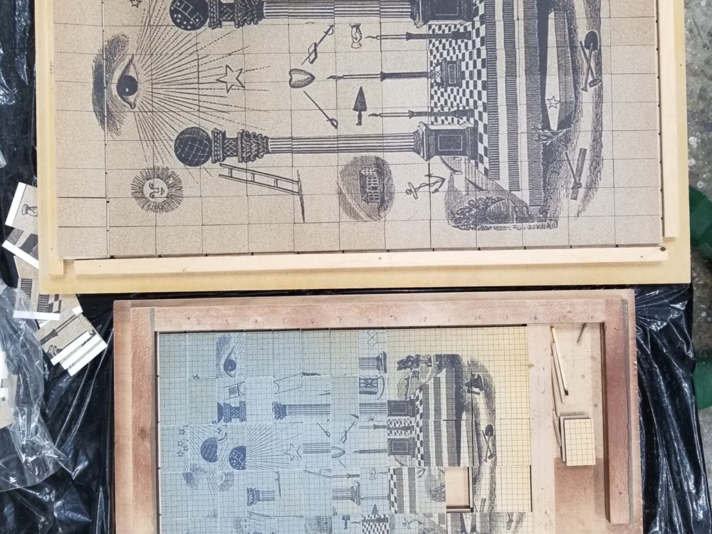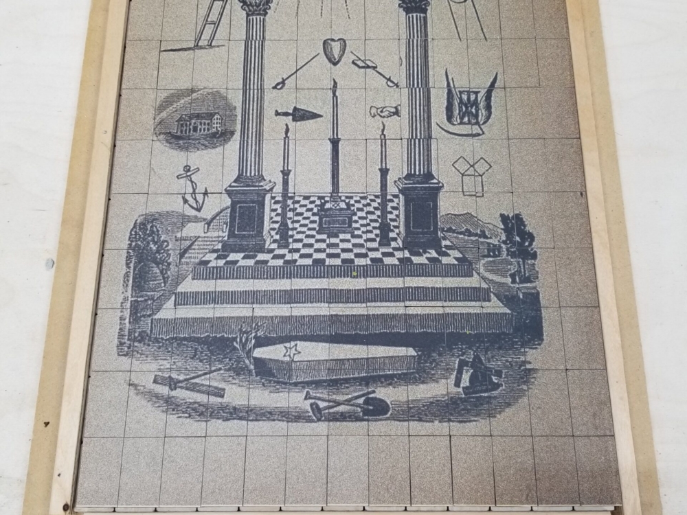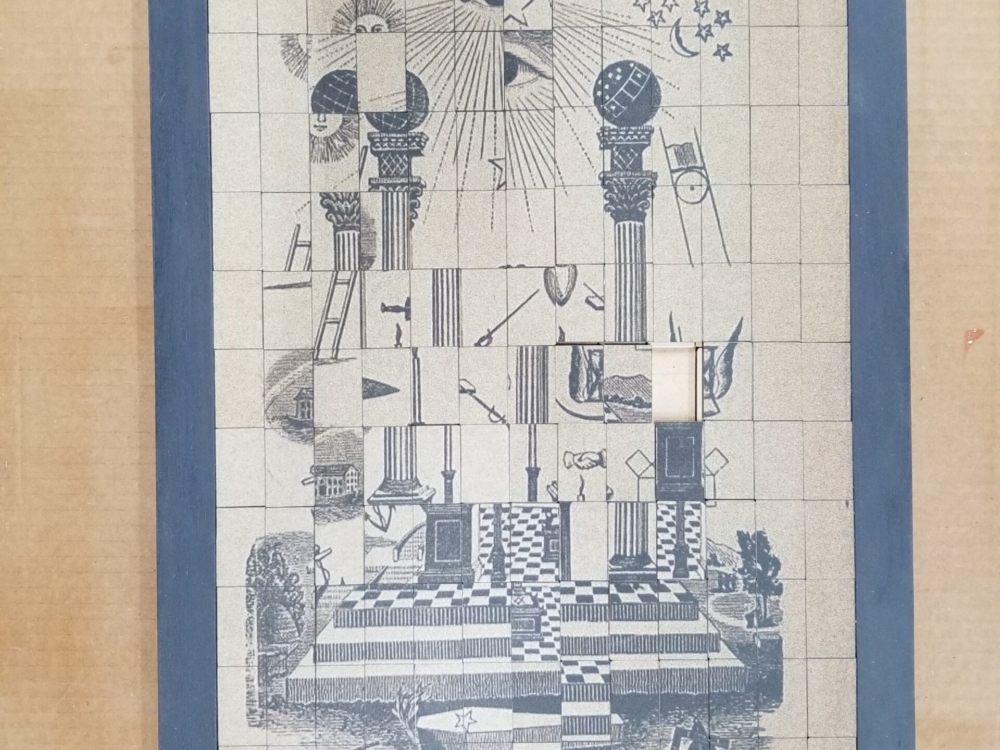 The “puzzle” central imagery references an historic tracing board; a training device of mystical symbol sets much familiar to Masonic lodge members.